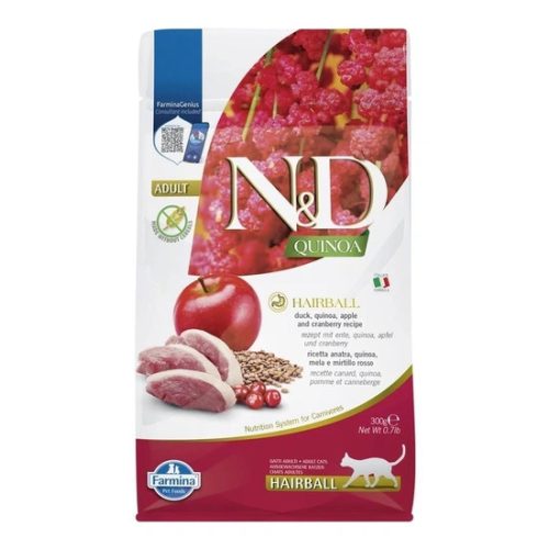 HAIRBALL - kacsa, quinoa, alma és vörösáfonya receptúra. Az N D Quinoa Hairball egy teljes értékű eledel macskák számára, amely a szőrlabdák kiürülésének elősegítésére javallott.