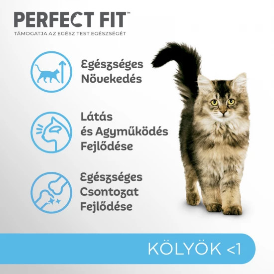 Etetési útmutató: 3 hónapnál fiatalabb cicának 45 - 55 g, 4-5 hónapos cicának 65-70g, 6-12 hónapos cicának 70-80g. 20 g szárazeledel helyettesíthető 1 db 85 g PERFECT FIT nedves eledel tasakkal. Számolja a jutalomfalatokból származó kalóriát. Az etetési mennyiségek csak iránymutatásként szolgálnak. A kölyökmacska életkorának, méretének és aktivitási szintjének megfelelően határozza meg az eledel mennyiségét. Az egész napos etetéshez ossza el adagokra. Kérjük, étrendváltáskor fokozatosan vezesse be az eledelt. További információkért kérjük, látogasson el weboldalunkra. Kínáljon hozzá friss vizet. Száraz, hűvös helyen tárolandó.