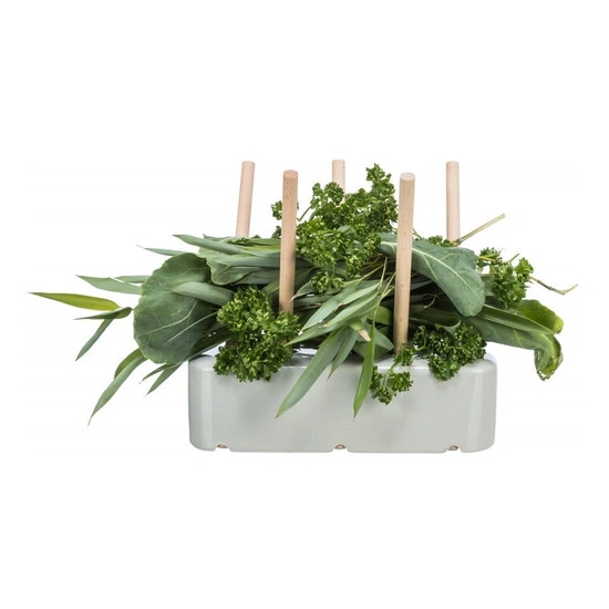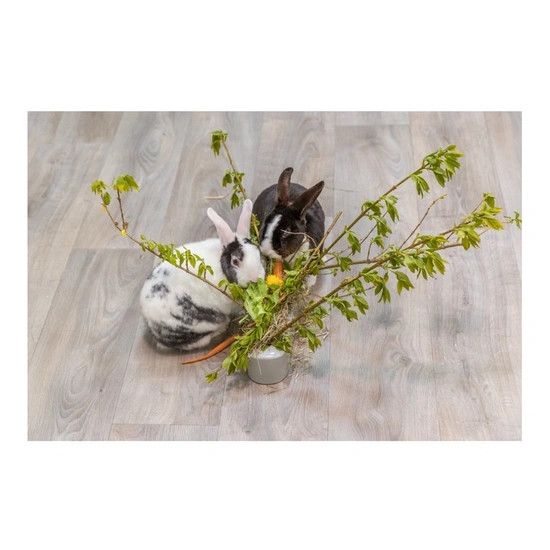 A tartó alkalmas fűvel, gyógynövényekkel, gallyakkal vagy szénával való töltéshez. Az extra rágcsálási élményért a fapálcák ágakra cserélhetők.