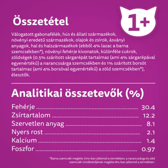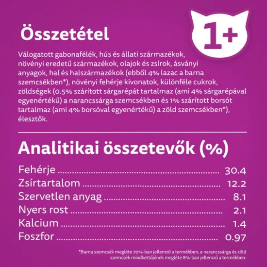 Összetétel:válogatott gabonafélék, hús és állati származékok, növényi eredetű származékok, olajok és zsírok, ásványi anyagok, hal és halszármazékok (ebből 4% lazac a barna szemcsékben*), növényi fehérje kivonatok, különféle cukrok, zöldségek (0.5% szárított sárgarépát tartalmaz (ami 4% sárgarépával egyenértékű) a narancssárga szemcsékben és 1% szárított borsót tartalmaz (ami 4% borsóval egyenértékű) a zöld szemcsékben*), élesztők. *Barna szemcsék megléte 70%-ban jellemző a termékben, a narancssárga és zöld szemcsék mindkettőjének megléte 8%-ban jellemző a termékben.