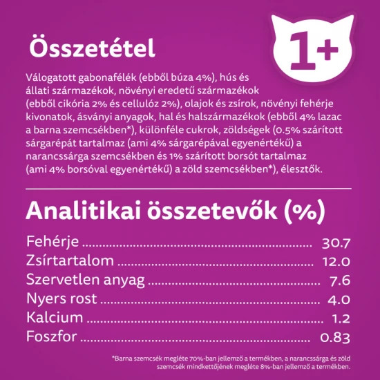 Összetétel: válogatott gabonafélék (ebből búza 4%), hús és állati származékok, növényi eredetű származékok (ebből cikória 2% és cellulóz 2%), olajok és zsírok, növényi fehérje kivonatok, ásványi anyagok, hal és halszármazékok (ebből 4% lazac a barna szemcsékben*), különféle cukrok, zöldségek (0.5% szárított sárgarépát tartalmaz (ami 4% sárgarépával egyenértékű) a narancssárga szemcsékben és 1% szárított borsót tartalmaz (ami 4% borsóval egyenértékű) a zöld szemcsékben*), élesztők. *Barna szemcsék megléte 70%-ban jellemző a termékben, a narancssárga és zöld szemcsék mindkettőjének megléte 8%-ban jellemző a termékben.